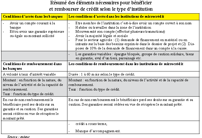 Les conditions d’accès et de remboursements des crédits sont identiques dans la plupart des institutions publiques comme privées, telles que résumées dans le tableau 1. Il ressort des données qu’elles sont aussi sévères dans les institutions de microcrédit que dans les banques. En effet, peu de conditions d’octroi sont demandées dans les banques classiques. Toutefois, elles sont très restrictives et s’assurent de la capacité de l’emprunteur avant toute transaction. Par contre, une panoplie de conditions est sollicitée par les IMC selon le type et le montant du prêt.