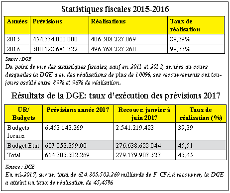 Du point de vue des statistiques fiscales, sauf en 2011 et 2012, années au cours desquelles la DGE a eu des réalisations de plus de 100%, ses recouvrements ont toujours oscillé entre 89% et 96% de réalisation.