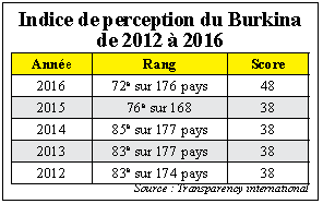 Transparency international (TI), une organisation internationale de la société civile qui œuvre dans la lutte contre la corruption, publie chaque année l’Indice de perception de la corruption (IPC) dont celui de 2016 a été rendu public le 25 janvier 2017. Sur 176 pays, le Burkina Faso se classe à la 72e place avec 42 points sur 100. Le Burkina Faso améliore ainsi son score des 4 dernières années qui se stabilisait à 38 points sur 100 depuis 2012.