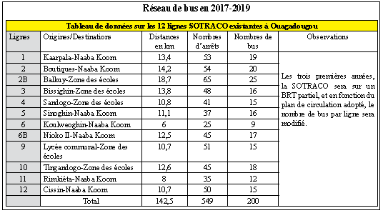 Ce réseau de bus initialement de 12 lignes sera complété progressivement par des lignes ordinaires et spéciales, avec un objectif de 30 lignes de bus à l’horizon 2020; réorganisé autour d’une gare centrale à construire et d’un système de BRT complet en 2022».