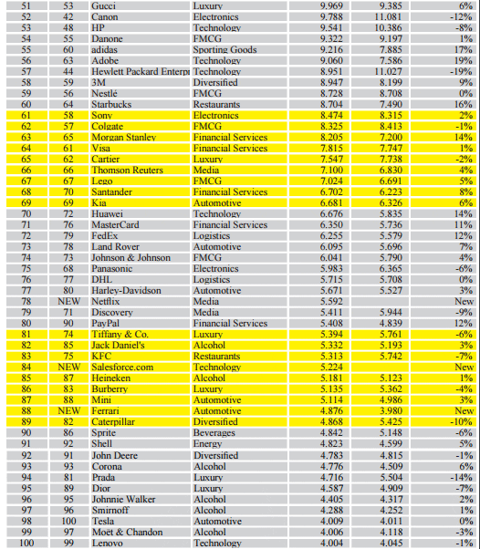 Le classement mondial de la valeur de la marque par Interbrand repose sur une analyse de la performance financière des produits et services d’une marque, du rôle que joue la marque dans la décision d’achats des consommateurs et de sa position concurrentielle.