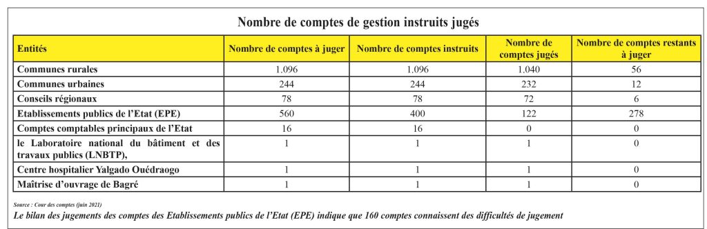 244 comptes de Communes urbaines étaient à juger, tous ont été instruits mais 232 ont été jugés et 12 restent à juger. Tous les 78 comptes des Conseils régionaux ont été instruits mais 72 ont été jugés et 6 restent à juger. Le bilan des jugements des comptes des Etablissements publics de l’Etat (EPE) indique que sur 560 comptes à juger, 400 ont été instruits, 122 jugés, 160 connaissent des difficultés et 278 restent à juger.