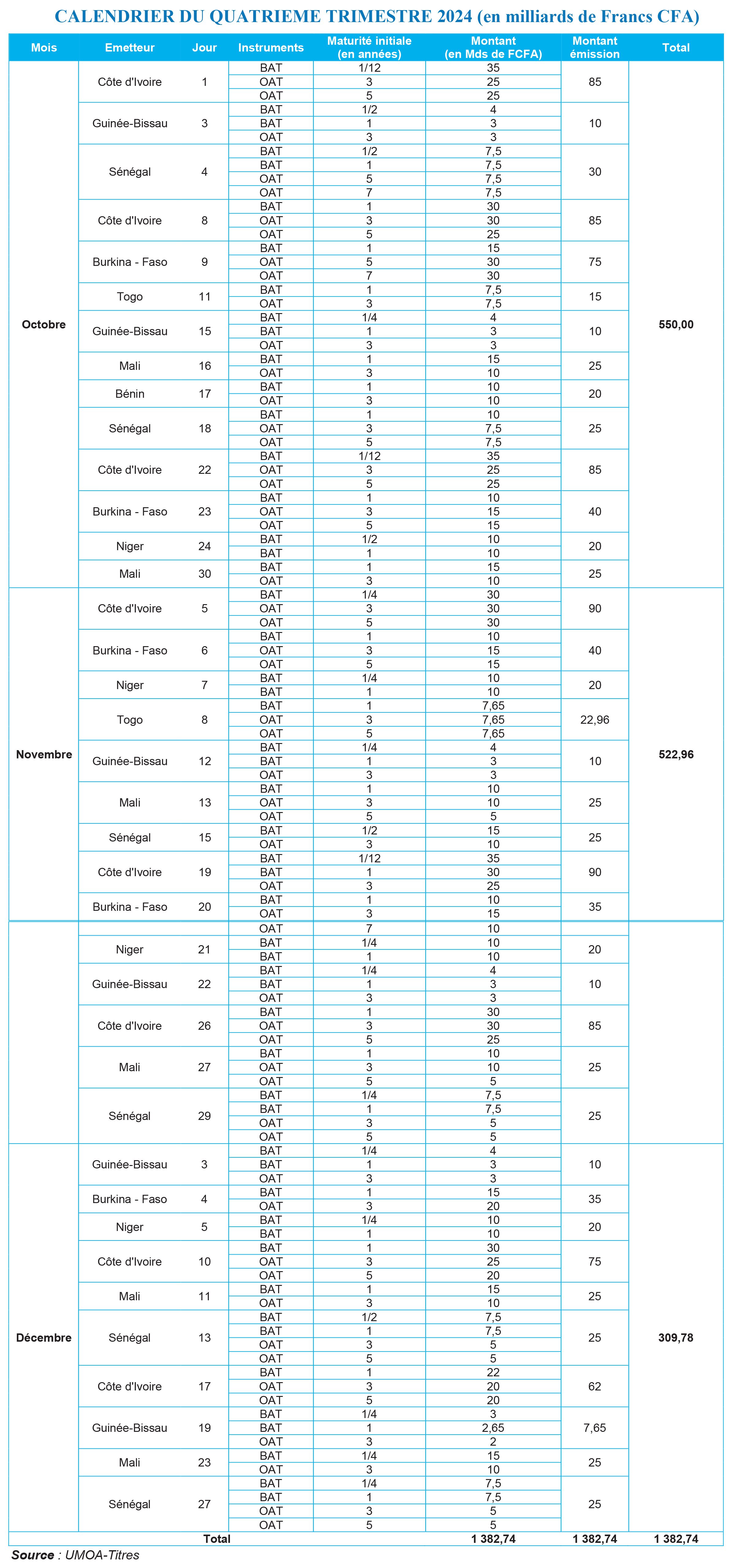 La 3e raison de cette baisse découle, elle, d’un constat. Pour certains pays, on constate une hausse des taux d’intérêt au niveau régional, ce qui rend les émissions de titres plus coûteuses pour les gouvernements. Sans oublier que le dernier trimestre de l’année peut présenter des défis économiques spécifiques, notamment, des ajustements budgétaires ou des limitations dues à la fin de l’exercice fiscal.