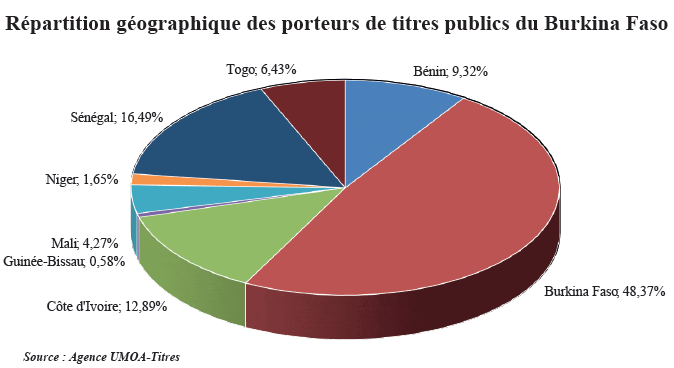 Ce volume a été mobilisé par adjudication, selon l’Agence UMOA Titres qui a rendu public, le 21 janvier dernier, le onzième numéro de son bulletin statistique. Dans la répartition du volume total mobilisé par émetteur au cours de la période du bulletin, le Burkina Faso se taille une part de 24%, contre 25% pour la Côte d’Ivoire. Ainsi, au 4e trimestre de l’année 2018, le pays se classe 2e de l’Union, juste avant la Côte d’Ivoire. Juste après, vient le Niger avec 22%, le Mali (13%), le Togo (8%) et le Bénin (7%). Notons que pour le Sénégal, aucune émission n’a été réalisée dans la zone UEMOA au cours du 4e trimestre 2018. En analysant le portefeuille des titres publics du Burkina Faso, émis par adjudication, on relève que la majorité des porteurs de titres du pays sont des nationaux. Ainsi, 48,37% des porteurs viennent du pays des Hommes intègres. Le Sénégal vient ensuite avec 16,49% de taux de participations, puis la Côte d’Ivoire avec 12,89% et pour conclure, le Mali et la Guinée-Bissau clôturent la liste des porteurs de titres publics avec respectivement 4,27% et 0,58%.