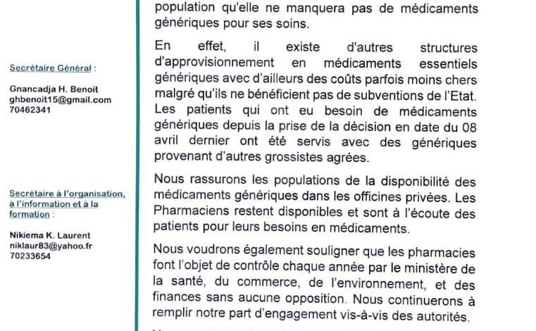 Dans un communiqué de presse parvenu à notre rédaction ce 11 avril 2023, le syndicat des pharmaciens du Burkina Faso rassure quant à la disponibilité de médicaments génériques.