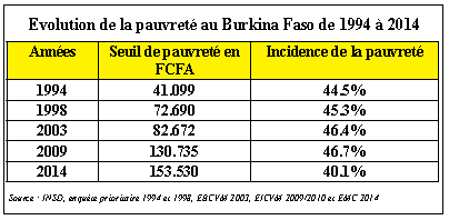 Le seuil de pauvreté est le montant minimum qu’une personne doit dépenser en consommation alimentaire, éducation, santé, habillement, etc., par an pour être considéré comme non pauvre aussi appelé seuil absolu de pauvreté monétaire. Ce seuil de pauvreté a été estimé par l’INSD à 153 530 FCFA par tête et au prix courant de Ouagadougou, soit environ 421 FCFA par tête et par jour en 2014. Ce seuil se décompose en une composante alimentaire de 102.040 FCFA et une composante non alimentaire de 51.490 F CFA. Sur la base de ce seuil, la meilleure estimation de l’incidence de pauvreté qui est la proportion des individus dont la dépense de consommation annuelle est en dessous de 153.530 FCFA est de 40,1%. L’incidence de la pauvreté alimentaire est de 57.7% et celle de l’extrême pauvreté, c’est-à-dire la proportion des individus qui ne parviendraient pas à couvrir leurs besoins en consommation alimentaire si toutes leurs ressources y étaient affectées, est de 11.1%. L’essentiel des personnes vivant dans l’extrême pauvreté sont dans le milieu rural, soit 94.4% de l’ensemble des personnes vivant dans l’extrême pauvreté.