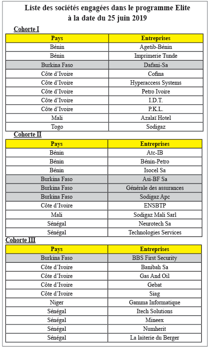 Le plus important accompagnement demeure le programme Elite. Si on veut en faire l’économie, nous sommes à 30 entreprises au total pour les trois cohortes. Pour la troisième cohorte qui vient d’être lancée le 24 juin 2019, BBS First Security SA y figure pour le compte du Burkina Faso.