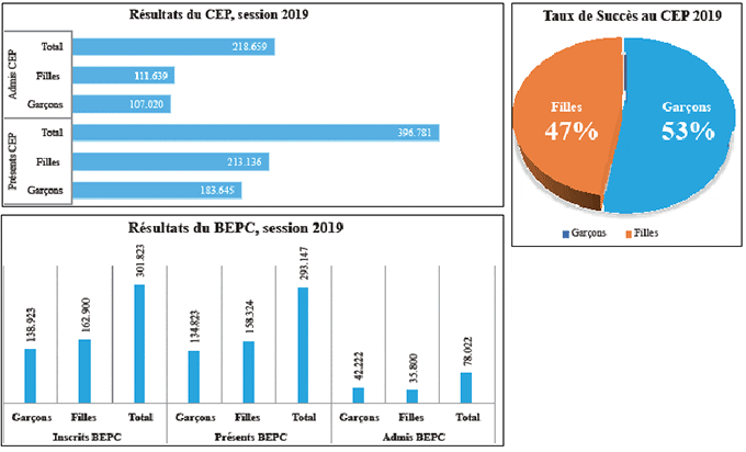 Pour la session 2019 du BEPC, on a dénombré 293.147 candidats présents le jour de la composition de l’examen, dont 134.823 garçons et 158.324 filles. Les filles qui ont composé le BEPC 2019 étaient les plus nombreuses, 54%, les garçons 46%. Mais sur les 78.022 admis, le nombre de garçons (42.222) dépassait celui des filles (35.800).