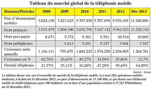 Ce rapport remis le 19 août dernier au Premier ministre par Mathurin Bako, président de l’Autorité, dévoile un parc d’abonnements se chiffrant exactement à 11.240.886, l’année écoulée. C’est près de 1,3 million de nouveaux abonnements au réseau mobile. Cette progression permet à l’Arcep de situer la télédensité mobile, c’est-à-dire le taux de pénétration du portable à près de 65% (64,89 téléphones pour 100 habitants). Ce taux est obtenu sur la base d’une population totale estimée à 17. 322. 976 habitants au 31 décembre 2013; donnée utilisée par l’Arcep et provenant des projections de l’Insd (Institut national de la statistique et de la démographie).