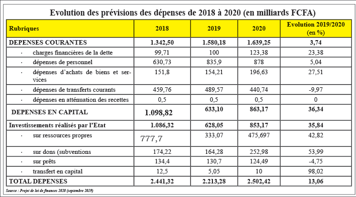 En matière de dépenses, les prévisions en 2020 se chiffrent à 2.502,42 milliards FCFA, contre 2.213,29 milliards FCFA en 2019, soit un accroissement de 289,12 milliards FCFA représentant 13,06% en valeur relative. Les dépenses courantes se chiffrent à 1.639,25 milliards FCFA en 2020 et représentent 65,51%. Les dépenses courantes enregistrent une hausse de 59,08 milliards FCFA entre 2019 et 2020, soit un taux relatif de 3,74%. Cet accroissement relativement faible traduit la volonté du gouvernement à réduire le train de vie de l’Etat à l’effet de dégager plus d’espace budgétaire pour les investissements. Les exonérations et subventions projetées en 2020 sont de 65 milliards FCFA. Elles se composent des subventions aux hydrocarbures et les exonérations des marchés publics dans le cadre de la réalisation des investissements financés sur ressources extérieures. 2020 connaîtra également l’organisation des élections présidentielle et législatives avec la participation des Burkinabè de l’extérieur pour la première fois. Les investissements sur ressources propres se chiffrent à 475,69 milliards FCFA en hausse de 42,82% par rapport à 2019. Ils représentent en moyenne 55,76% des dépenses totales d’investissements. Les investissements financés sur ressources extérieures composées de dons et de prêts projets se chiffrent à 377,47 milliards FCFA, dont 252,98 milliards FCFA pour les dons projets et 124,49 milliards FCFA pour les prêts projets. Ils se sont accrus de 27,96% en valeur relative par rapport à 2019.