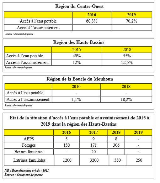 Selon Wendemin Cyprien Tizambo, la Direction subventionne la construction des latrines familiales (écoles, temples, églises, mosquées, infrastructures marchandes…). C’est dans cette logique que 35 écoles primaires, grâce au projet BID/UEMOA, ont bénéficié de 24 latrines. Le taux d’accès à l’eau qui était de 49% en 2015 est passé à 55% en 2018. Pendant ce temps, le taux d’accès à l’assainissement est passé de 12% en 2015 à 22,5% en 2018. Dans la région, l’Etat burkinabè a injecté la somme de 1 milliard 500 millions FCFA en 2017 et 250 millions en 2019. Wendemin Cyprien Tizambo plaide pour une mobilisation conséquente des ressources financières et l’apport des partenaires techniques et financiers pour l’atteinte des ODD qui visent un accès universel et équitable à l’eau potable, à l’hygiène et à l’assainissement d’ici à 2030, en particulier, pour les populations vulnérables.