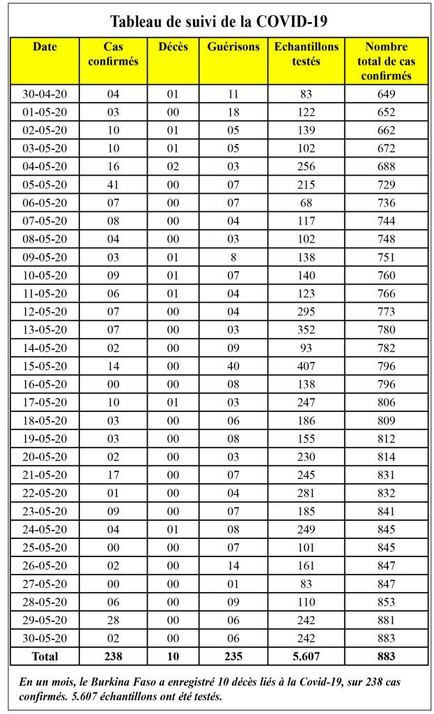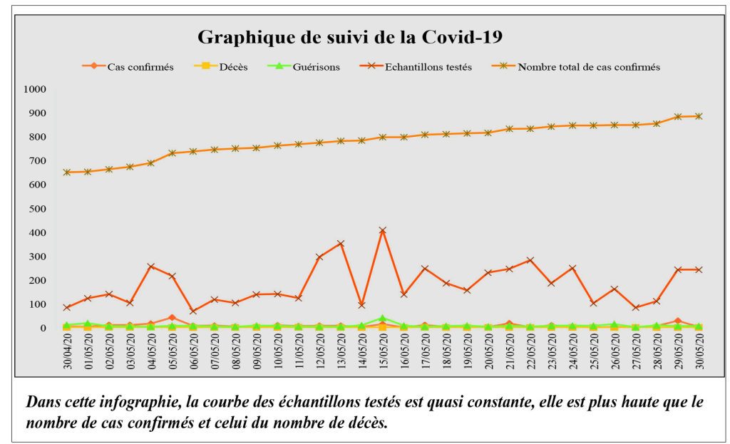 A ce niveau, les chiffres montrent une tendance à la baisse de ces transmissions communautaires depuis fin mars. Il y a plus de cas importés que de transmissions communautaires. Autre point à relever, les cas de transmissions communautaires recensés viennent des deux capitales du pays. Les autres foyers ont été maîtrisés. Le pays a enregistré 9 décès entre le 30 mars et le 30 mai 2020 pour 883 cas au total (confère tableau de suivi de la Covid-19).