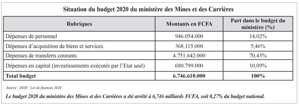 Le ministère des Mines et des Carrières est le parent pauvre en matière d’allocation budgétaire. Dans le budget initial 2020, le budget du ministère a été arrêté à 6,746 milliards FCFA, alors que le budget national total est de 2.518,456 milliards FCFA. Le budget de ce ministère représente 0,27% du budget national. Dans le cadre de la mise en œuvre du Fonds de financement de la recherche géologique et minière et de soutien à la formation sur les sciences de la terre, en 2019, la somme de 9,518 milliards FCFA a été répartie aux bénéficiaires, dont 951,817 millions FCFA pour le Fonds d’équipement du ministère des Mines. Cette somme dépasse de loin le budget 2020 destiné aux investissements de ce ministère budgétisés à 680,799 millions FCFA. Le taux d’exécution financière des 951,817 millions FCFA est de 32,49%. Le solde a été réservé dans le budget 2020 du ministère qui doit recevoir environ un milliard FCFA dans le cadre de ce Fonds. Le faible taux d’exécution est injustifiable, dans la mesure où les agents du ministère manquent de moyens pour les activités, dont l’organisation des missions de contrôle sur le terrain, sur des sites miniers, l’organisation des missions d’audit des activités minières, la pesée de l’or, etc. Il est de même pour l’opérationnalisation des Directions régionales qui tarde à voir le jour.
