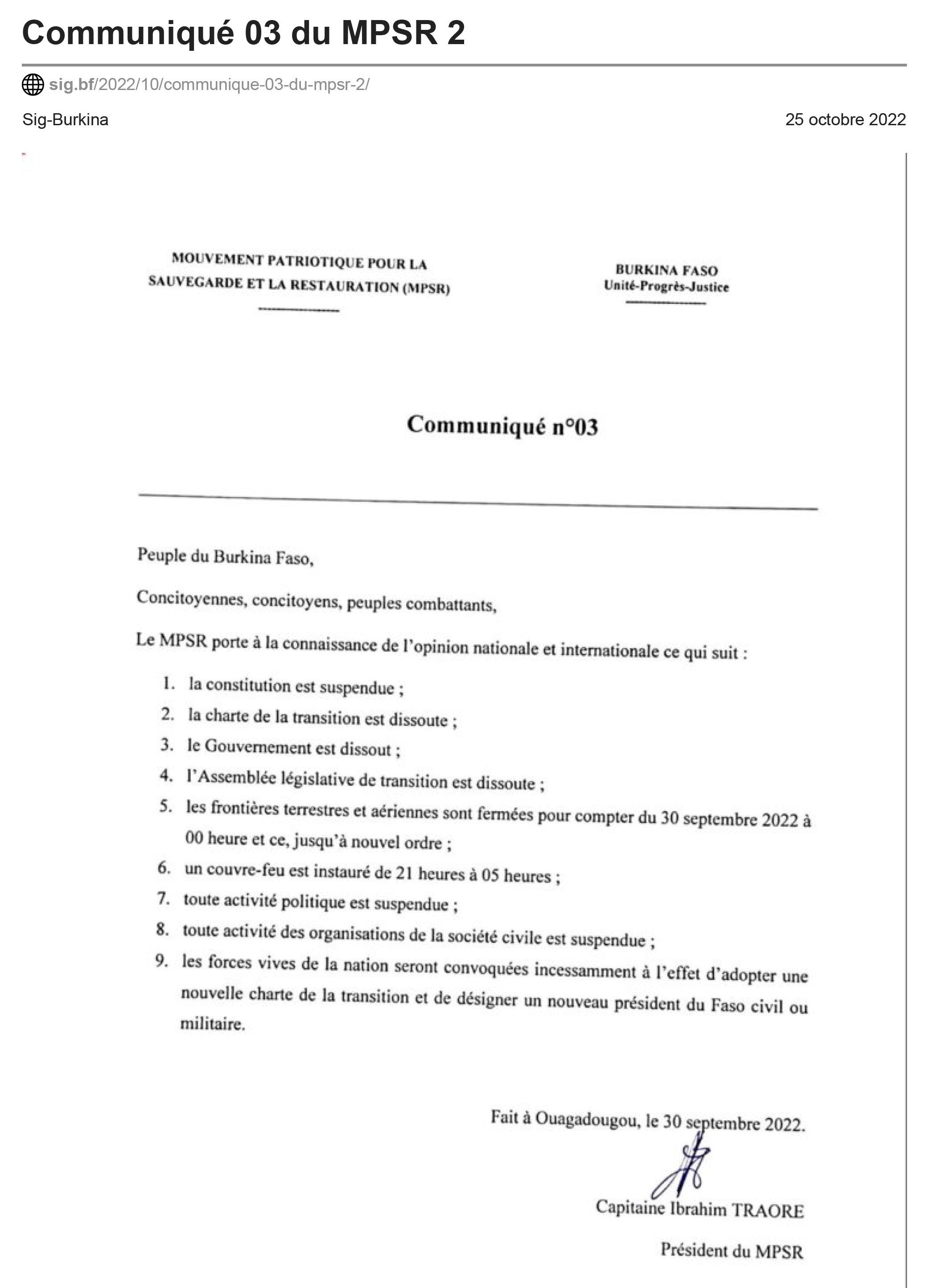 Malgré les dénonciations, la situation de deux poids, deux mesures perdure. Et on ne perçoit aucun signe annonciateur de la levée de la mesure. On s’y attendait avec le rétablissement de la Constitution, dont la suspension était contenue dans le communiqué n°3, ainsi que d’autres mesures comme l’instauration d’un couvre-feu, la fermeture des frontières terrestres et aériennes jusqu’à nouvel ordre, etc. La réhabilitation de la loi fondamentale a remis au goût du jour les droits, les devoirs et les libertés reconnus aux citoyens. Mais les autorités ont décidé que les partis politiques ne pourront pas mener leurs activités en maintenant la suspension dans leur communiqué de fin septembre qui, juridiquement, est devenu caduque avec l’entrée en vigueur de la Constitution.