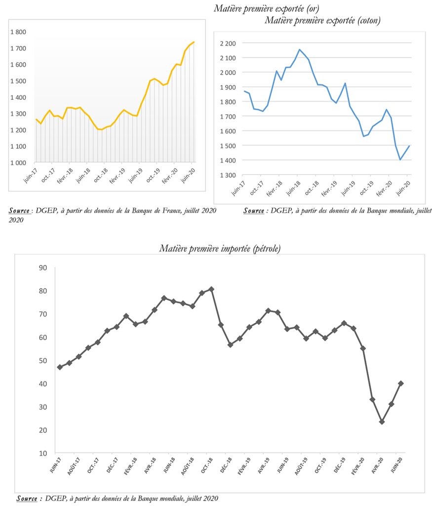 Concernant les principales matières premières exportées, le cours mondial de l’once d’or enregistre en juin 2020, une hausse de 1,1% en se situant à 1 735,3 dollars US contre 1 715,7 dollars US un mois plus tôt. L’once d’or s’est élevée en moyenne à 1 710,3 dollars US au second trimestre 2020, soit une hausse de 7,9 % par rapport au trimestre précédent. Quant au cours du coton, il a enregistré une hausse de 3,2% en se situant à 1 494,5 dollars US en juin 2020 contre 1 448,4 dollars US en mai. En moyenne, le cours mondial du coton est de 1 447,9 dollars US, en baisse de 11,9% par rapport au trimestre précédent. Pour ce qui est du pétrole, produit importé, le cours du baril a enregistré une hausse de 28,7% en juin 2020, en se situant à 39,9 dollars US contre 31,0 dollars US un mois plus tôt. En moyenne trimestrielle, le cours du baril s’élève à 31,4 dollars US, en recul de 37,9% par rapport au premier trimestre. En glissement annuel, le cours est en baisse de 36,9% en juin 2020.