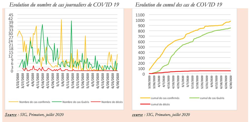 Au 30 juin 2020, la situation sanitaire fait état d’un total de 980 cas confirmés positifs au coronavirus. Parmi ces cas, 852 guérisons ont été enregistrées contre 53 décès, soit environ à 86,9% de taux de guérison et 5,4% de létalité.
