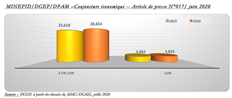 Dans le secteur des mines, en juin 2020, la production totale d’or industrielle est évaluée à 4,8264 tonnes contre 4,509 tonnes le mois précédent, soit une hausse de 7,0%. Cette production est en hausse de 3,5% par rapport au même mois de l’année passée. Par rapport au trimestre précèdent, la production d’or a connu une hausse de 5,7% au deuxième trimestre 2020.