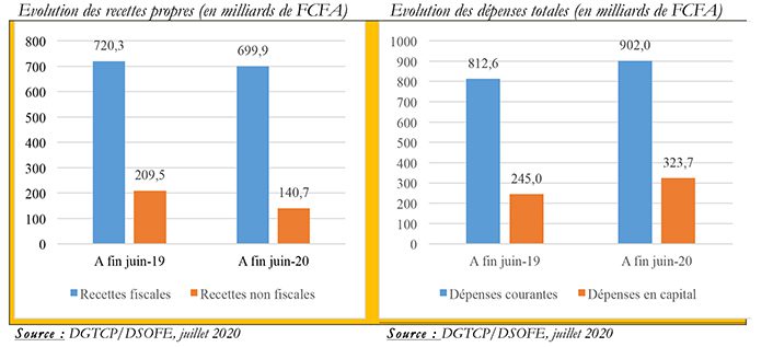 Au niveau des finances publiques, à fin juin 2020, les recettes propres du budget de l’Etat ont été mobilisées à hauteur de 840,6 milliards de FCFA contre 929,8 milliards de FCFA à la même période en 2019, soit une baisse de 9,6%. Quant aux dépenses totales du budget de l’Etat, elles ont été effectuées à hauteur de 1 225,7 milliards de FCFA contre 1 057,6 milliards de FCFA à la même période en 2019, soit une hausse de 15,9%.
