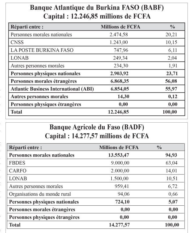 La Lonab, société d’Etat, possède des actions au sein des banques. La nationale des jeux a acheté des actions au sein de la Banque Atlantique du Burkina Faso (2,04%), 10,51% dans la Banque agricole du Faso et 6,56% de la Société financière de garantie interbancaire du Burkina.