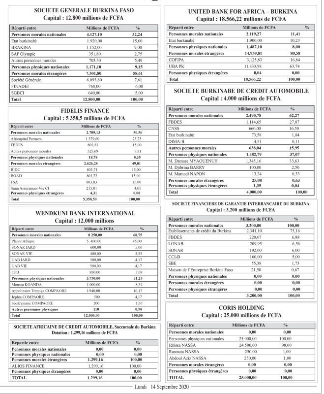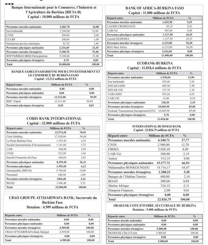 Au 31 décembre 2019, la capitalisation totale des 20 institutions financières est de 246.253,35 millions F CFA, soit un peu plus du budget consacré au secteur de la santé en 2020 (234,502 milliards FCFA). C’est dire le volume que brassent ces institutions bancaires au Burkina Faso. Des banques, dans lesquelles des personnes morales et physiques nationales détiennent des parts plus ou moins conséquentes. Qui sont ces hommes et femmes qui possèdent des parts dans les banques nationales ? Quelle est la proportion détenue ? Zoom sur ceux qui détiennent des actions au sein de ces 15 banques, 4 établissements financiers et une holding au Burkina Faso.