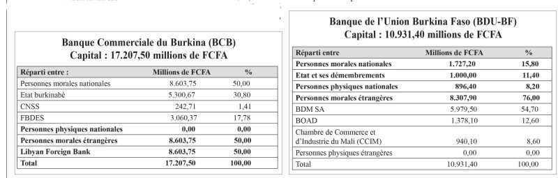 La Lonab, société d’Etat, possède des actions au sein des banques. La nationale des jeux a acheté des actions au sein de la Banque Atlantique du Burkina Faso (2,04%), 10,51% dans la Banque agricole du Faso et 6,56% de la Société financière de garantie interbancaire du Burkina.