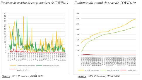 A fin août 2020, il est fait état d’un total de 1 378 cas confirmés positifs au Coronavirus. Parmi ces cas, 1 079 guérisons ont été enregistrées contre 55 décès. Ces évolutions correspondent à 78,3% de taux de guérison et 3,9% de létalité.