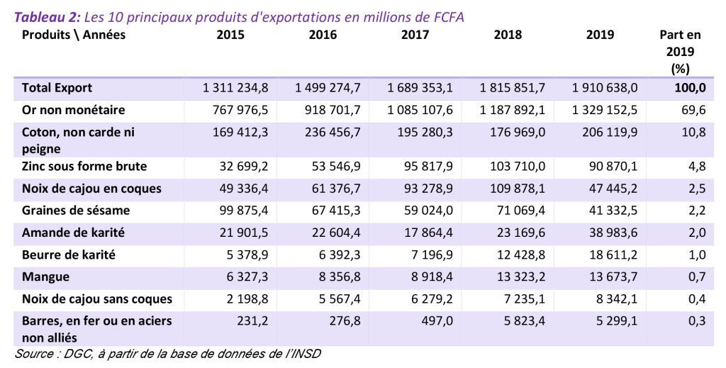 Bien que les exportations d’or aient connu une augmentation en valeur de 2018 à 2019, il y a eu une baisse en quantité de 52, 5 tonnes à 50,8 tonnes. Les exportations de coton correspondent à 218.400 tonnes en 2019.