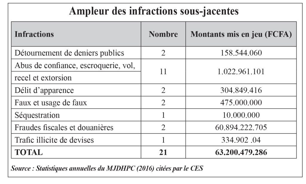 En termes de nombre, le Burkina compte, selon les données du ministère de la Justice, 21 infractions sous-jacentes en 2016. Les montants mis en cause sont évalués à 63,200 milliards FCFA. Abus de confiance, escroquerie, vol, recel et extorsion sont les plus nombreuses en nombre avec 11 dossiers portant sur un montant en jeu de l’ordre de 1,022 milliards F CFA. Les fraudes fiscales et douanières sont également importantes et sont de l’ordre de 60,894 milliards F CFA.