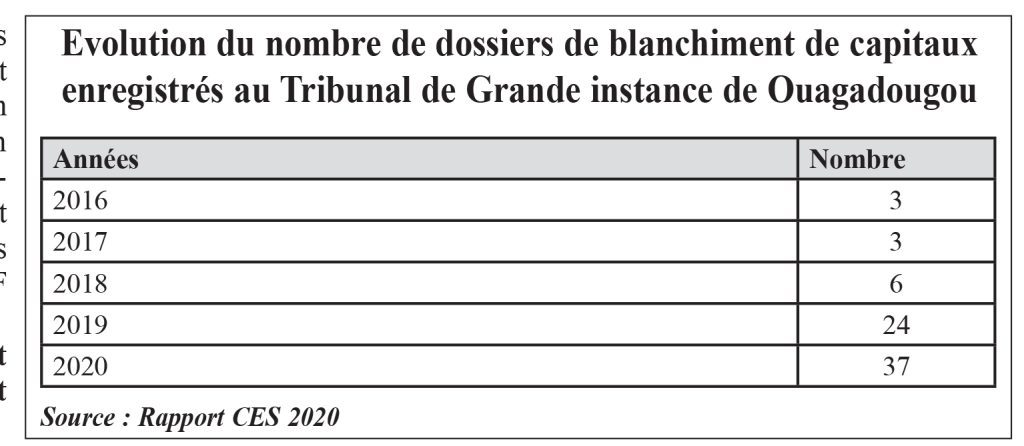 Pour le rapport, le Burkina Faso se place au troisième rang en termes de déclarations d’opérations suspectes en lien avec le blanchiment de capitaux dans l’espace UEMOA. Relativement à d’autres pays de l’UEMOA, on peut dire qu’au Burkina Faso, les assujettis, notamment, les banques et autres établissements financiers, sont plus respectueux de leurs obligations dans la lutte contre le blanchiment de capitaux et le financement du terrorisme Toutefois, ces statistiques n’impliquent pas nécessairement que le phénomène de lutte contre le blanchiment de capitaux et le financement du terrorisme s’accroît plus rapidement au Burkina Faso ou au Bénin.
