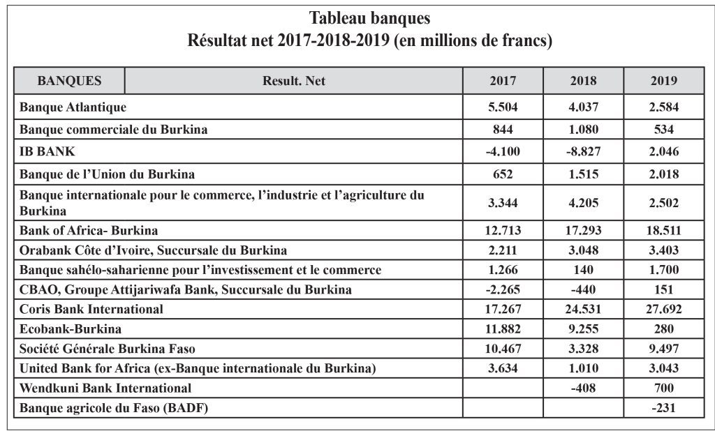 L’activité bancaire au Burkina Faso se porte bien, en témoigne le résultat net des banques. Il est passé de 61.145 millions FCFA en 2018 à 75.476 millions en 2019. Une performance tirée par Coris Bank International, la Société Générale Burkina Faso ; United Bank for Africa (ex-Banque internationale du Burkina) et Wendkuni bank international.