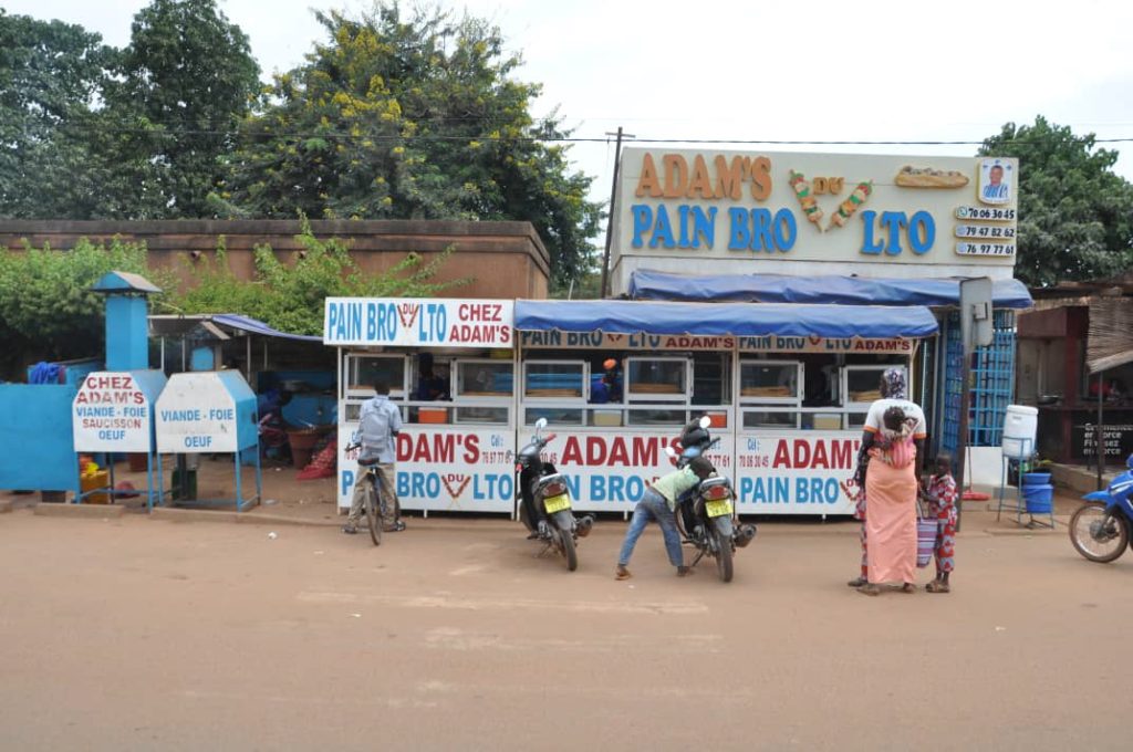 Alors qu’il vient de boucler son année scolaire de la classe de 6e , à Zorgho, dans la région du Plateau central, et doit aller en classe supérieure, il dut se résoudre à abandonner les bancs, faute de moyens. Il met en exergue son talent de dessinateur au profit des élèves en quête du certificat d’études primaires pour leurs cahiers de présentation. Mais la périodicité d’une telle activité ne lui permet pas de subvenir à ses besoins. Il rejoint son père, boucher au marché de la cité An II, dans l’Arrondissement 1 de Ouagadougou. Là, il se rend vite compte que la vente de la viande crue ne procure pas non seulement beaucoup de bénéfice, mais n’occupe pas non plus toute la durée de la journée. Il décide alors de se lancer aussi dans la grillade de viande. Les premières démarches pour trouver un emplacement sont infructueuses. Grâce à un ami étudiant, il obtient partiellement son emplacement actuel, 4m2 , devant une cour. Les premiers moments de cohabitation avec les occupants de la cour sont sulfureux. Voir un fourneau, une table et deux bancs devant la porte ne plaît pas à tout le monde, le jeune homme d’à peine 20 ans et son ami soufflent le chaud et le froid pour se faire accepter. A cela, il fallait intégrer les réalités propres aux novices : « Il y avait des moments où, lorsque je vendais aujourd’hui, le lendemain, je ne sortais pas, car je n’avais pas l’argent nécessaire pour acheter ce qu’il fallait. Je n’arrivais pas à rentabiliser. A ce moment aussi, je travaillais avec deux personnes, qui, un jour, m’ont abandonné sans m’informer, parce que je n’arrivais pas à les rémunérer convenablement », affirme-t-il. Pour le label, le calligraphe avait déjà troqué « Adama » pour « Adams » qu’il avait fièrement gravé déjà sur la table de vente de son père. Il ajouta « pain bro » au diminutif de son prénom, pour faire maintenant « Adam’s pain bro » ou le pain brochette de chez Adama.