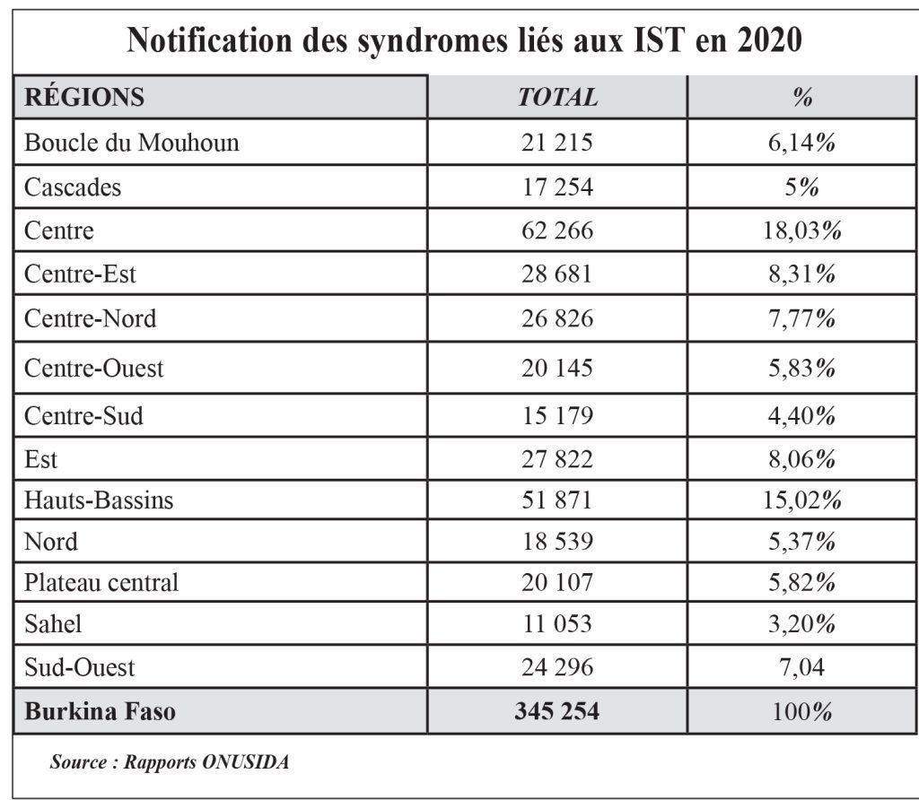 La répartition par région indique que celles du Centre (62.266 cas) et des Hauts-Bassins (51 871 cas) enregistrent les plus grands nombres de notifications syndromiques des cas d’IST en 2020.