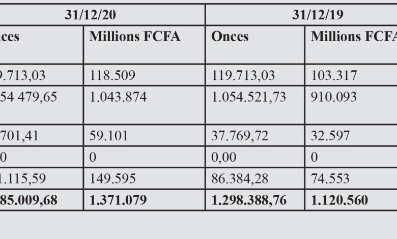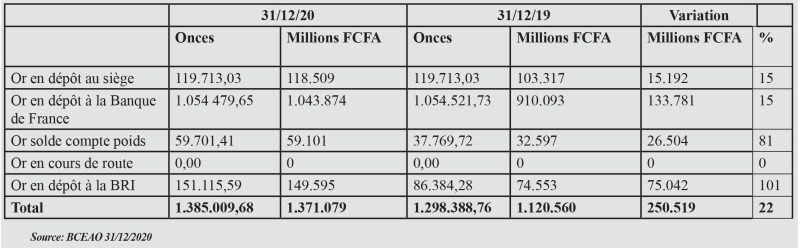 e taux des avoirs en or détenu au siège de la BCEAO et à la Banque de France a connu une hausse de 22% entre fin décembre 2019 et fin décembre 2020. L’augmentation des avoirs en or est liée à l’effet cumulé de l’appréciation du cours moyen de l’once d’or et de la hausse du volume du stock d’or qui est de 43.036,08008 kg ou 1.385.009,68 onces au 31 décembre 2020, contre 40.384,40524 kg ou 1.298.388,76 onces au 31 décembre 2019, suite aux achats d’or effectués sur la période.