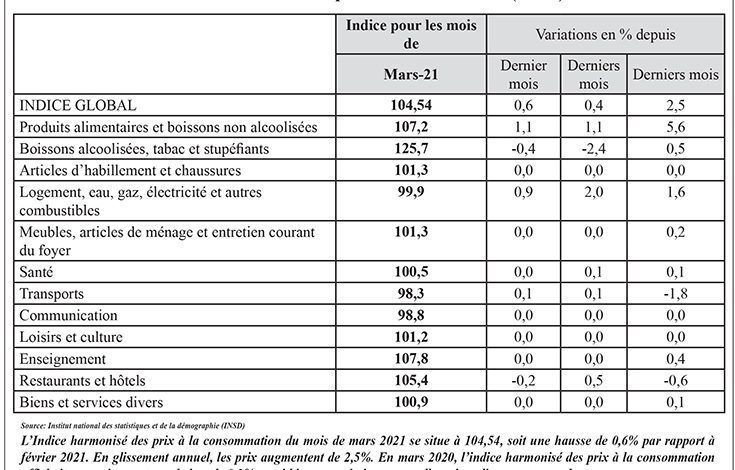 Il fallait s’y attendre. L’augmentation du prix des hydrocarbures et de la bouteille de 12,5 kg de gaz butane le 23 mars 2021 a eu un impact sur le niveau général des prix à la consommation. Ainsi, l’Indice harmonisé des prix à la consommation du mois de mars 2021, publié mi-avril par l’INSD, affiche une hausse de 0,6% par rapport à février 2021. Et entre mars 2020 et mars 2021, les prix ont augmenté de 2,5%.
