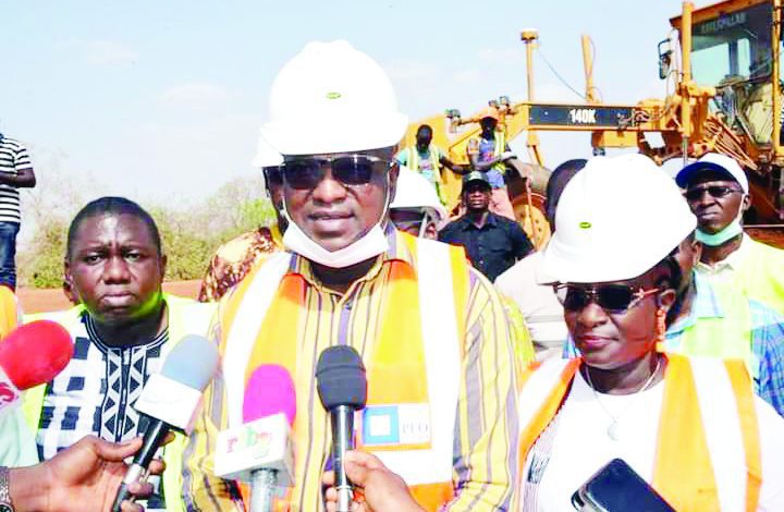 En compagnie de sa collègue de la Culture, Élise Ilboudo, et de ses collaborateurs, le ministre des Infrastructures et du Désenclavement, Éric Bougouma, est allé constater de visu l’avancement des travaux de bitumage du tronçon Bogandé-Fada (RN 18). Puis, il s’est assuré du début effectif des travaux sur la RN4, tronçon Fada-Gounghin. C’était le 15 avril 2021.