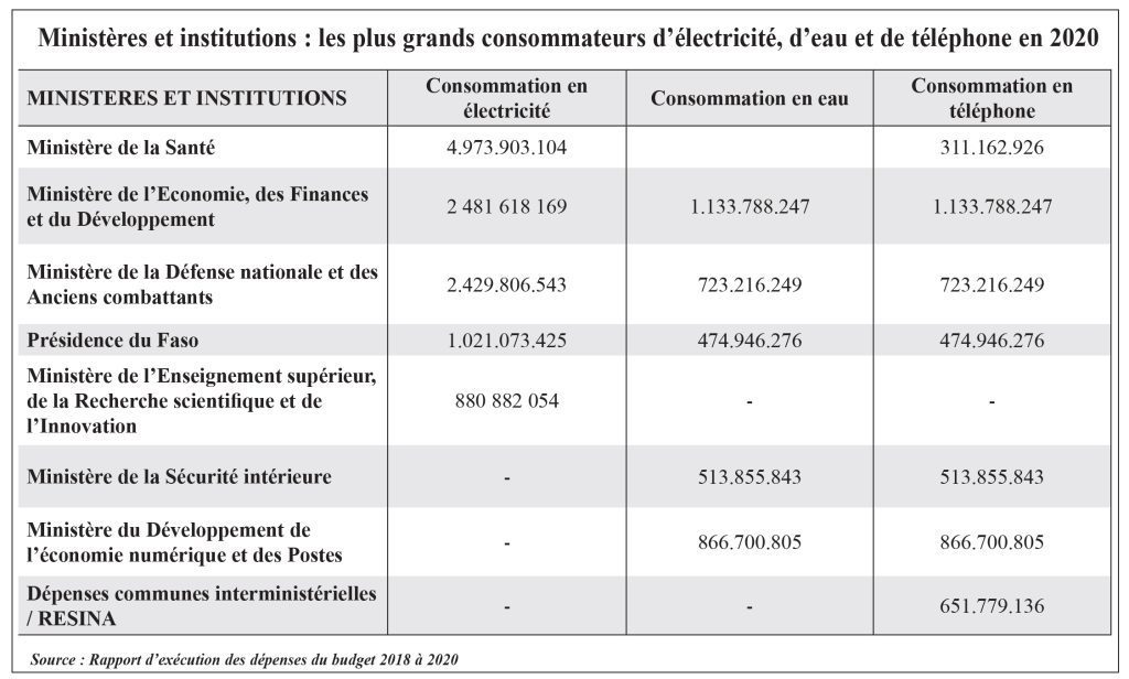 Par ailleurs, d’autres ministères ont enregistré des baisses relativement importantes. Il s’agit, notamment, du ministère de l’Urbanisme et de l’Habitat (-53,82%), du Médiateur du Faso (-22,14 %), du ministère de la Fonction publique, du Travail et de la Protection sociale (-12 %). Le rapport sur la situation d’exécution du budget et de la trésorerie de l’Etat, exercice 2020, prévoit : « L’acquisition des batteries de condensateurs au profit des ministères et institutions s’avère très prometteur pour une réduction conséquente de leurs consommations d’électricité ».