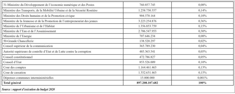Cinq ministères cumulent 84% des dépenses de personnel. Le ministère de l’Education nationale, de l’Alphabétisation et de la Promotion des langues nationales présente la masse salariale la plus élevée. Avec une enveloppe de 395,482 milliards FCFA, les dépenses salariales de ce ministère représentent 44,08% des dépenses totales de l’année. Selon les données 2019 du ministère de la Fonction publique, ce ministère compte 56,08% de l’effectif total de la Fonction publique. Ce ministère est suivi par celui de la Santé. Avec une enveloppe de 121,134 milliards FCFA, ses dépenses représentent 13,50% de l’ensemble des dépenses de personnel en 2020. En troisième position, on retrouve le ministère de la Défense nationale et des Anciens combattants, 13,30%, le ministère de la Sécurité, 9,25% et le ministère de l’Economie, des Finances et du Développement, 3,87%.o
