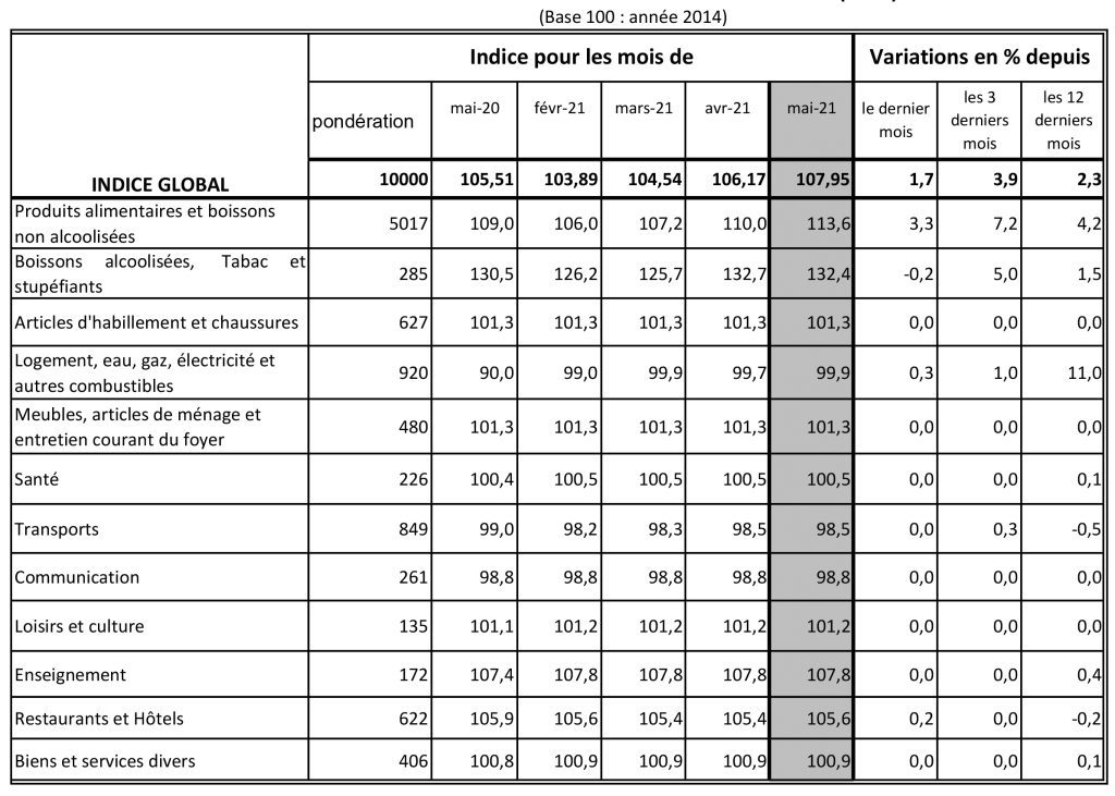 a consommation a connu une hausse de 1,7% et se situe à 107,95. L’information a été publiée sur le site de l’Institut national de la démographie (INSD), le 9 juin dernier. En comparaison annuelle, entre mai 2020 et mai 2021, les prix ont augmenté de 2,3%.