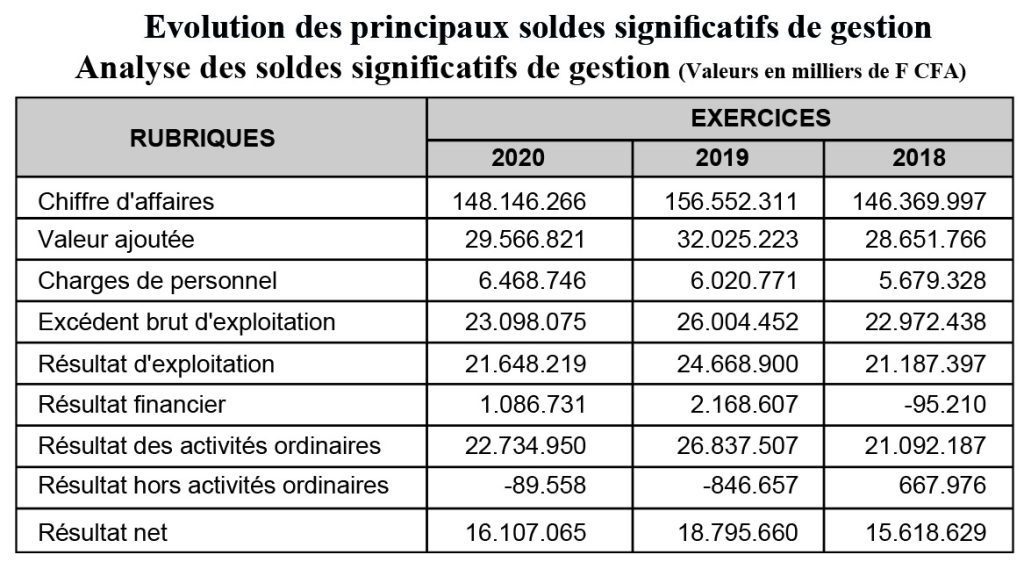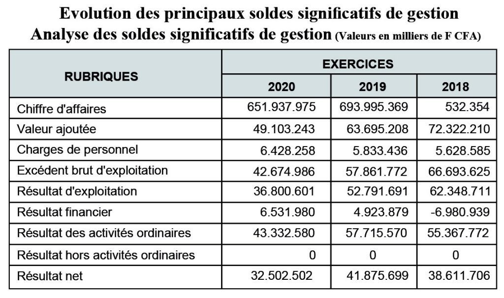 D’une manière générale, l’analyse du tableau montre une détérioration des soldes significatifs de gestion au cours de l’exercice 2020. En effet, la valeur ajoutée, l’excédent brut d’exploitation et le résultat d’exploitation ont baissé respectivement de 14,592 milliards, de 15,187 milliards et de 15,991 milliards FCFA du fait des effets conjugués de la diminution du chiffre d’affaires et de la forte augmentation des « autres charges diverses » représentant la plus-value au titre de l’exercice 2020. Ainsi, le résultat net a régressé en passant de 41,875 milliards FCFA à 32,503 milliards FCFA en 2020, nonobstant la hausse du résultat financier.