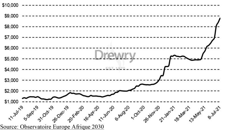 Les explications du Secrétaire général du ministère de l’Industrie, du Commerce et de l’Artisanat, en son temps, en trois points, à savoir la Covid-19 et ses conséquences, la crise sécuritaire et la hausse du dollar : « En effet, la Covid-19 a entraîné la hausse des cours des matières premières et du fret, entraînant ainsi une augmentation des prix des produits de grande consommation. A cela s’ajoute la crise sécuritaire nationale qui a occasionné le déplacement des populations de certaines zones agricoles vers les centres urbains ». Quant à la hausse du cours du dollar, ces conséquences sont répercutées sur le transport et le prix des produits importés sensibles que sont l’huile végétale, les céréales, etc. d’où le renchérissement du prix du fret qui, selon l’indice Drewry « World containers index », le coût du fret a passé pratiquement de 800 dollars US en mars 2019 à 6.500 USD en août 2021 pour les routes maritimes Asie/Europe/USA/Afrique. Pour les importateurs burkinabè, « ce coût de fret qui s’évaluait à 40 dollars la tonne se situe désormais autour de 110 dollars ». Ce renchérissement » est curieusement lié à une bonne nouvelle, l’économie mondiale redémarre, d’où la pression sur les conteneurs, d’où les délais de plus en plus longs pour les obtenir et accomplir les rotations.
