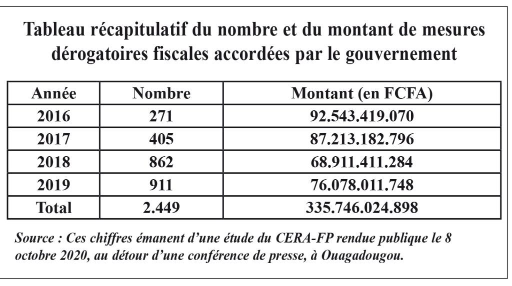 Celles-ci bénéficient de la part de l’Etat, des (exonérations fiscales et douanières et autres incitations fiscales) suivant des choix révélés ou discrétionnaires dans le but de créer plus d’emplois et partant, créer la croissance nationale. Pour le CERA-FP, ces exonérations desservent plus les intérêts du pays qui fait face déjà à plusieurs défis de développement.