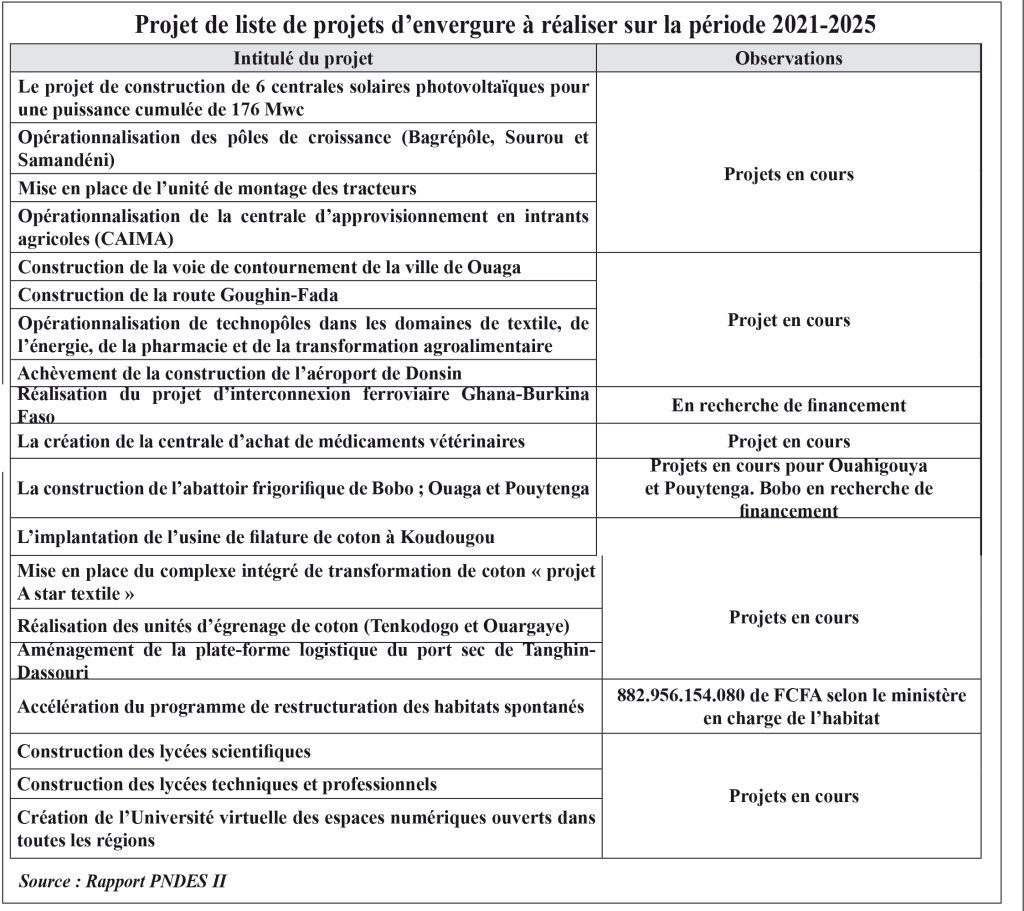 Le gouvernement burkinabè nourrit de grandes ambitions avec le Plan national de développement économique et social (PNDES) II 2021-2025. Celles de réaliser rapidement la croissance économique. Toute chose qui passe par des investissements structurants de qualité, à travers la mise en œuvre de grands projets d’envergure nationale. Il s’agit, entre autres, du projet de construction de l’aéroport de Donsin, du 2e Compact du MCA et du Compact régional (financement d’une deuxième ligne d’importation d’énergie avec la Côte d’Ivoire), du projet de construction du chemin de fer Burkina–Ghana, des projets de développement des pôles de croissance et de compétitivité, des projets miniers intégrés et l’autoroute Ouagadougou-Abidjan, ainsi que les projets désignés par le terme « initiatives présidentielles ». Cette option économique va accélérer la création d’emplois décents et partant, réduire la pauvreté.