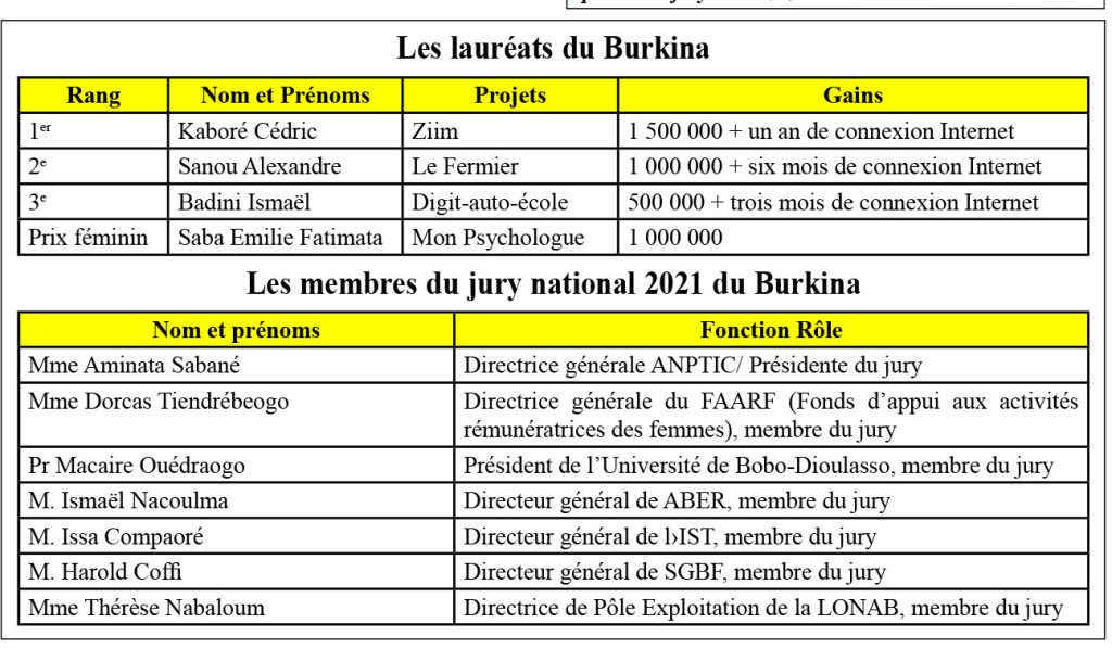 Au Burkina Faso, l’édition 2021 a connu la participation de 84 entrepreneurs au total. Dix (10) dossiers ont retenu l’attention du comité de lecture pour passer devant le jury national, dans la journée du vendredi 17 septembre 2021, dans l’enceinte de Orange Campus à Ouagadougou. A l’issue des auditions, quatre projets ont retenu l’attention du jury présidé par la Directrice générale de l’Agence nationale de promotion des TIC (ANPTIC), Mme Aminata Sabané, sur la base des critères édictés : impact social et environnemental, innovation, réplication dans d’autres pays, viabilité financière et caractère réaliste du projet. Il s’agit, par ordre de mérite, de Kaboré Cédric avec son projet « Ziim », de Sanou Alexandre avec son projet « Le Fermier » et de Badini Ismael avec son projet « Digit-auto-école ». Ils remportent respectivement 1 500 000 FCFA et 12 mois de connexion Internet, 1 000 000 FCFA et 06 mois de connexion Internet, 500 000 FCFA et 03 mois de connexion Internet. Le Prix spécial féminin est revenu à Saba Emilie Fatimata pour son projet « Mon Psychologue ». Elle décroche la somme de 1 000 000 F CFA.