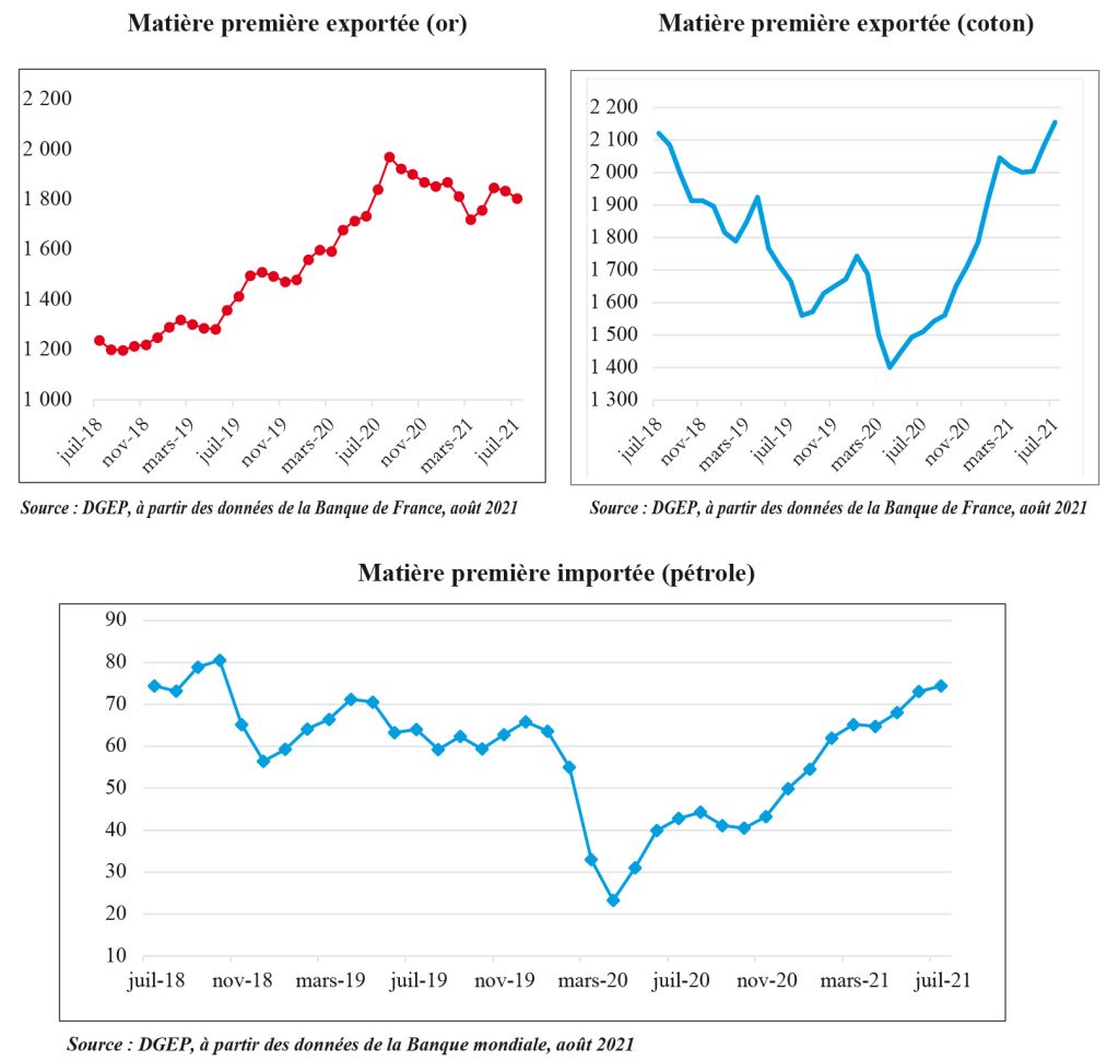 Concernant les principales matières premières exportées, le cours mondial de l’once d’or a enregistré en juillet 2021, une baisse de 1,6% par rapport au mois précèdent, en s’affichant à 1 805,9 dollars US. En glissement annuel, il est en hausse de 1,9%. La baisse du cours de l’or en juillet 2021 pourrait s’expliquer principalement par la reprise économique mondiale qui rend l’or moins attractif pour les investisseurs. Quant au cours du coton, il a enregistré en juillet 2021 une hausse de 3,4% par rapport au mois de juin en s’affichant à 2 153,9 dollars US la tonne.
