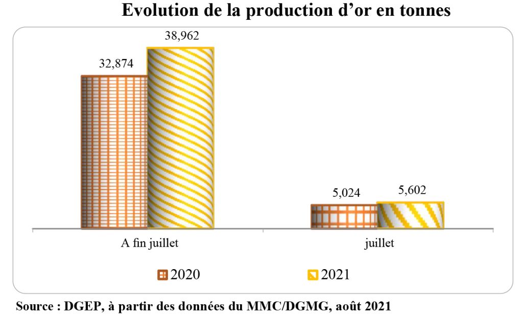 A fin juillet 2021, la production totale d’or fin est ressortie à 38,962 tonnes contre 32,874 tonnes à fin juillet 2020, soit une hausse de 18,5%.