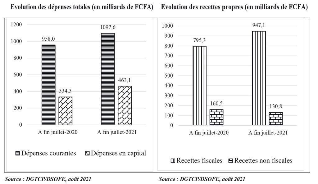 Au niveau des finances publiques, à fin juillet 2021, les recettes propres du budget de l’Etat ont été mobilisées à hauteur de 1 077,9 milliards de FCFA en hausse de 12,7% par rapport à fin juillet 2020. Cette augmentation est imputable aux recettes fiscales (+151,8 milliards de FCFA, soit 19,1%), les recettes non fiscales s’étant affichées en baisse (-29,7 milliards de FCFA, soit -18,5%).