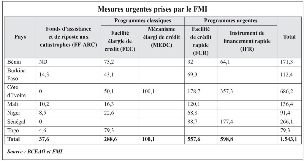 Dans le cadre des actions urgentes du Fonds monétaire international consistant à l’annulation d’environ 37,6 milliards FCFA de la dette des pays à faibles revenus, le Burkina Faso a bénéficié des bons de soutien et de résilience. Au 24 septembre 2021, il a bénéficié de 45,5 milliards FCFA. Dans le cadre de l’Initiative de suspension du service de la dette (ISSD) dont le but est d’alléger, à court terme, la charge financière de la dette des pays afin de leur éviter une crise de la dette dans le contexte de la pandémie de Covid-19, le Burkina Faso a bénéficié de 9,1 milliards FCFA.
