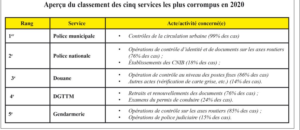 La Police municipale vient en tête des services les plus corrompus. Elle occupe cette place depuis 2016. Elle est suivie de la Police nationale qui a quitté la 9e place en 2016 et 3e rang en 2019 pour se situer à la 2e place en 2020. La Douane, 3e, quitte la 2e place qu’elle occupait en 2019. La Direction générale des transports terrestres et maritimes (DGTTM) reste au 4e rang comme en 2019. La Gendarmerie aussi stagne au 5e rang entre 2019 et 2020. D’autres services ont vu leur situation se dégrader entre 2019 et 2020. La Justice est passée du 10e au 7e rang, l’Enseignement secondaire passé du 7e au 6e rang et les Collectivités territoriales passées du 12e au 10e rang.