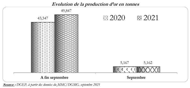 A fin septembre 2021, la production totale d’or fin est ressortie à 49,847 tonnes, contre 43,347 tonnes à fin août 2020, soit une hausse de 15,0%.