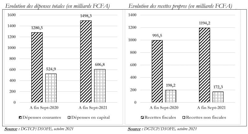 Quant aux dépenses totales du budget de l’Etat à fin septembre 2021, les dépenses totales du budget de l’Etat ont été exécutées à hauteur de 2105,0 milliards FCFA, soit une hausse de 16,6% par rapport à fin septembre 2020. Cette progression a été portée par les dépenses courantes (+217,8 milliards FCFA, soit +17,0%) et les dépenses en capital (+81,9 milliards FCFA, soit +15,6%).